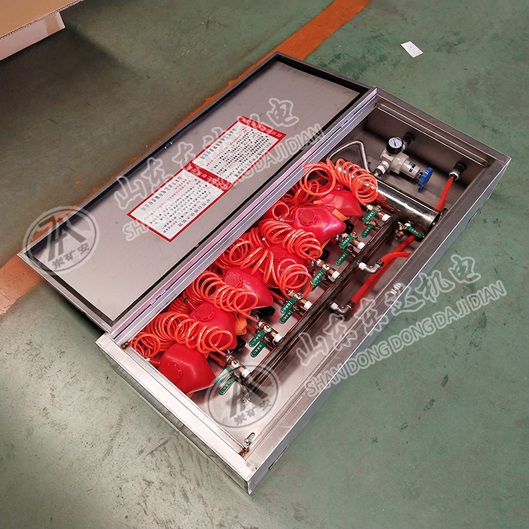 矿井压风自救供水系统在压风自救装置的基础上增加了,进水管、净水过滤器、水型压力表、排水装置(多组)等。同样箱体、安装板、总进气管、总进水管采用不锈钢制造而成。一箱六组供水,六组供气(可根据要求设计组别)。